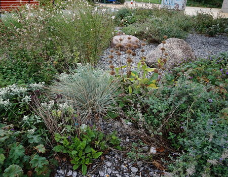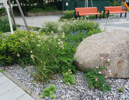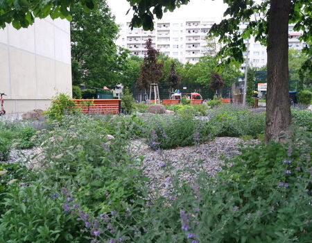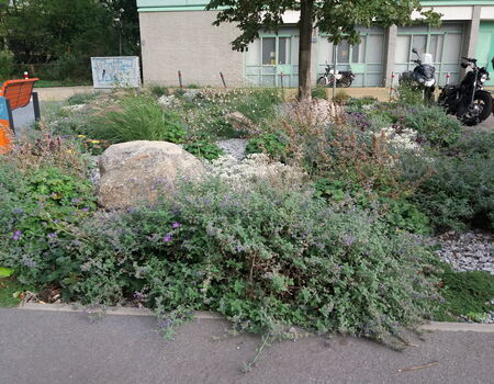 Die Fotos dokumentieren den Zustand vor Baubeginn, nach Abschluß der Arbeiten im Sommer 2019 und das Aussehen im Mai, Juli und September 2020, August 2021. Die jüngsten Fotos wurden Mitte Juli 2023 aufgenommen. In der mineralischen Vegetationstragschicht hat sich die Bepflanzung robust entwickelt und am Standort etabliert. So ist zu wünschen, dass auch nach dem Ende der vierjährigen Pflege durch die Landschaftsbaufirma alle Nutzer die Anlage respektieren und sich daran erfreuen können.
