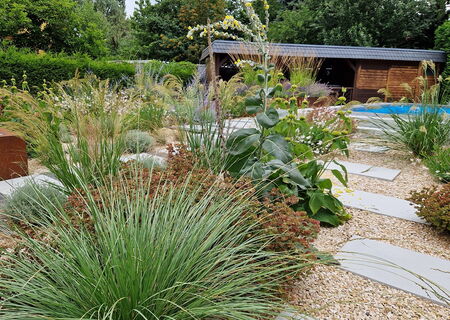 In Seminaren bildete ich mich zu diesem Thema weiter und nahm bei Gartenreisen (Queen der Kiesgärten: The Beth Chatto Gardens; Kirkey Cottage Garden) viele Inspirationen von gelungen Pflanzenkombinationen auf. Inzwischen plante ich bei kommunalen Projekten und bei privaten Hausgärten Flächen mit mineralischer Vegetationstrag- und Mulchschicht. Geeignete robuste Pflanzen haben sich etabliert und überdecken inzwischen die größten Teile der Kies-/Splittflächen. Die Tragschicht besteht aus verschiedenen Größen von mineralischem Material und Grünkompost (je nach Standort und gewünschtem Ergebnis). Der Pflegeaufwand zu konventionell angelegten Beeten ist deutlich reduziert.