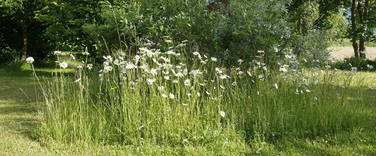 Vor einem Bauernhof in Ostseenähe befand sich jahrelang eine große Rasenfläche. Die engagierten Hofbesitzer wünschten sich 2012 Veränderung. So sind die großzügigen, mit kräftigen Farben angelegten Stauden-und Rosenbeete bereits von der Dorfstraße aus ein Hingucker. Sie rahmen den Blick in die weite Landschaft ein. Besonders die Bewegung der Halme im Gräserbeet, beim oft kräftig wehenden Wind, haben es der passionierten Gärtnerin angetan.