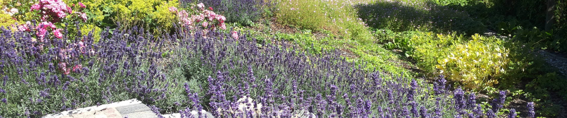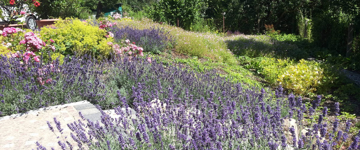 Konzeption der Freiflächen einer Tierarztpraxis in Mecklenburg. Pflanzpläne abgestimmt auf Besonderheiten. Trockene, warme, schmale Südwestseite - Kiesbeet mit Lavendel, Salbei, Heiligenkraut, Walzenwolfsmilch, Silber-Garbe. Schattige Böschung im Osten mit diversen Storchschnabel. Vorgarten mit Bank unter altem Apfelbaum, von Gräsern umpflanzt. Rosenbeet.