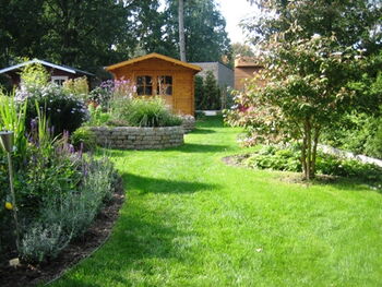 Eine reizvolle und spannende Aufgabe bestand 2007 darin, einen sehr schmalen 60 m² großen Garten zu strukturieren und die Aufenthaltsqualität zu verbessern. Ein Sitzplatz im Schatten und die lineare Beetgestaltung mußten weichen. Organisch geschwungene Linien bilden die Basis sowohl für Stauden- und Rosenbeete als auch für das Hochbeet aus Natursteinblöcken mit eingebauter Sitznische. In Eigenregie setzte die Familie die Gartenplanung um. So kann sie vom sonnigen, geschützten Sitzplatz den jetzt abwechslungsreichen Garten genießen.