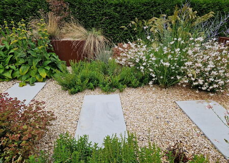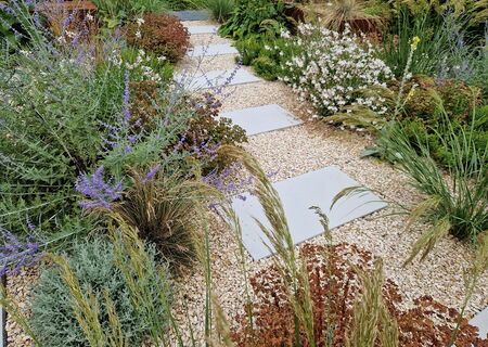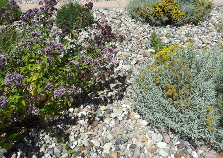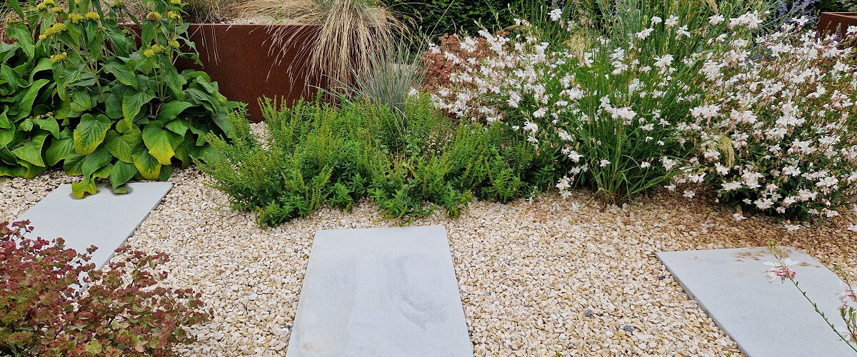 Trockene Kies- und Schotterflächen sind Standorte für Pflanzen, die nicht oder nur sehr wenig gegossen werden müssen und damit helfen, den Wasserverbrauch für den Garten / die Grünfläche zu reduzieren.
