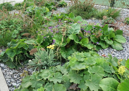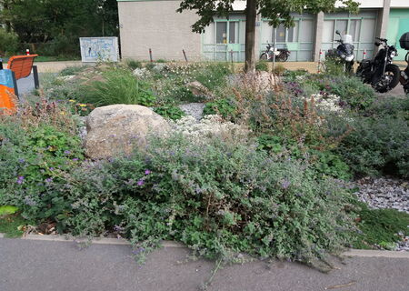 In Seminaren bildete ich mich zu diesem Thema weiter und nahm bei Gartenreisen (Queen der Kiesgärten: The Beth Chatto Gardens; Kirkey Cottage Garden) viele Inspirationen von gelungen Pflanzenkombinationen auf. Inzwischen plante ich bei kommunalen Projekten und bei privaten Hausgärten Flächen mit mineralischer Vegetationstrag- und Mulchschicht. Geeignete robuste Pflanzen haben sich etabliert und überdecken inzwischen die größten Teile der Kies-/Splittflächen. Die Tragschicht besteht aus verschiedenen Größen von mineralischem Material und Grünkompost (je nach Standort und gewünschtem Ergebnis). Der Pflegeaufwand zu konventionell angelegten Beeten ist deutlich reduziert.