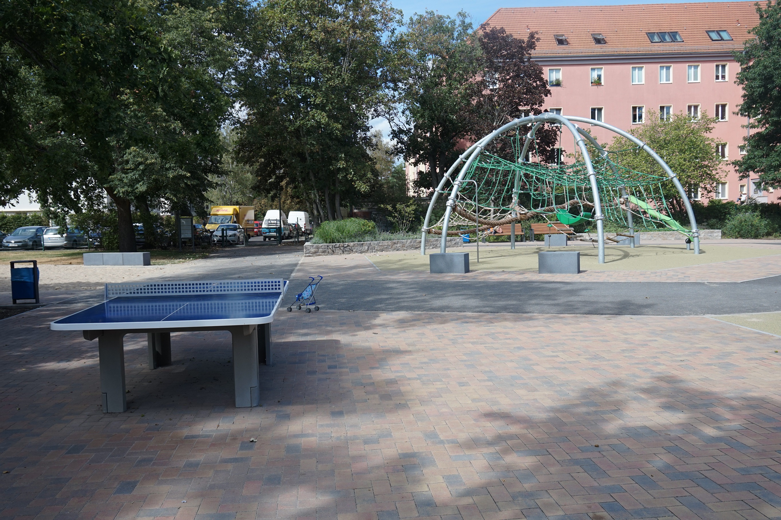 Der Kiez e.V. hat sich engagiert um den seit 2016 geschlossenen Kinderspielplatz Dusekestraße gekümmert und über eine Kooperation mit "Aktion Mensch" finanzielle Mittel organisiert. Das BA Pankow als Eigentümer der Fläche stellte für Planung und Bau des Spielplatzes den Hauptteil der Finanzierung (Abriß, Entsorgung; Hauptgerät "Arena", Nestschaukel mit Sandkasten, Tischtennisplatte; Holzbänke, Betonsitzelemente, Hochbeete, Anlehnbügel, Papierkörbe; Bepflanzung mit Bäumen, Sträuchern, Gräsern, Stauden und Rasen; Bolz- und Streetbasketballplatz mit Ballfangzaun und Kunststoffbelag; Betonpflaster- und Asphaltwege; Eingangstor). Unter dem Schlüsselwort INKLUSION war die finanzielle Zuwendung seitens "Aktion Mensch" an die Integration von Spielgeräten und Ausstattungen des Herstellers KOMPAN gebunden (Kleinkindspielstrecke mit Wippe, Schwingspiel, Klettergerät mit Rutsche und Klangelement; Drehscheibe, Drehtrichter, bodentiefes Karussell; Bolztore, Streetbasketball; Kletterwürfel; Sitzelemente) . Gefordert waren rollstuhlgerechte Beläge (Kunststoffbeläge als Fallschutz) sowohl unter den von Aktion Mensch geförderten Geräten und als auch unter der "Arena".