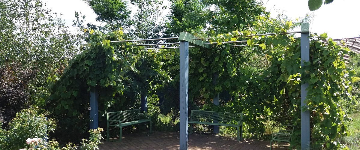 Gestaltung der Freifläche hinter dem Bürogebäude als Pausen- und Aufenthaltsbereich mit Pergola, Bänken, Baum-, Gehölz-, Stauden- Gräserpflanzung, Neuordnung der Stellplätze für PKW und Fahrräder.